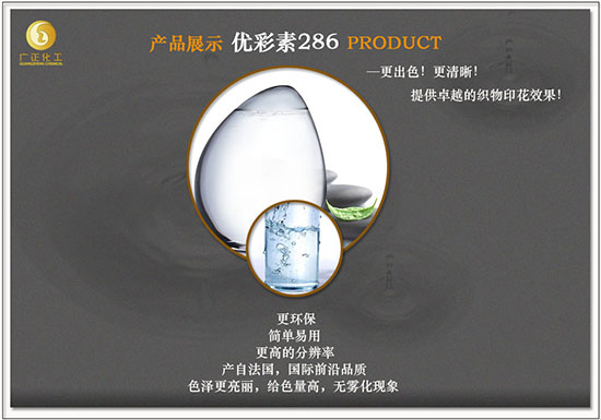 現在,以上(shang)問題都可以有一(yī)個解決方案了,因(yin)爲終于👨❤️👨有了㊙️一個(ge)可以令紡織産品(pǐn)顔色 更鮮豔、輪廓(kuò)更清晰的數碼印(yìn)花助劑—數碼印花(huā)增色劑 (優彩素286) ,它(ta)源于國際前沿法(fǎ)國,是一隻高清數(shù)碼印花增色劑,不(bú)但令色澤更亮麗(li),設計分辨率更高(gao),而且回潮🔴率穩定(ding),漿後布面不發硬(ying),便于數碼打印,更(geng)令人驚喜是操🧑🏽🤝🧑🏻作(zuò)極其方便,即開即(jí)用,無需放置,減少(shao)浪費✔️,成本極低。當(dāng)然,它一定是環保(bao)産品,絕對不含?APEO。如(ru)欲☁️咨詢,廣正化工(gōng)願意詳細跟您解(jiě)說,有興趣可緻電(diàn)4008696388